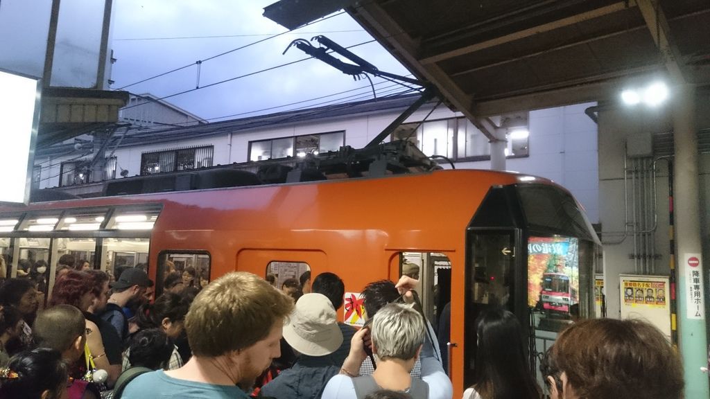 進到月台已經是五點多了,要搭的車是往鞍馬方向,車門一打開瞬間塞滿了人,我非常克難的站在離門口還算近的位置。開車後稍微環顧了一下週邊,大概九成九都是觀光客,而且沿途還有人擠上來,到鞍馬站時我已經離車門有點距離了。為什麼說九成九呢,在某個站原本站在我身後的旅客非常大聲地說「對不起我要下車~」的日文然後一路擠下去,除了這位旅客以外剩的都是擠上來的人。車上十分擁擠,而且印象最深的是車上並沒有吊環可以握,只能扶著別人的椅背或者很遠的行李架。